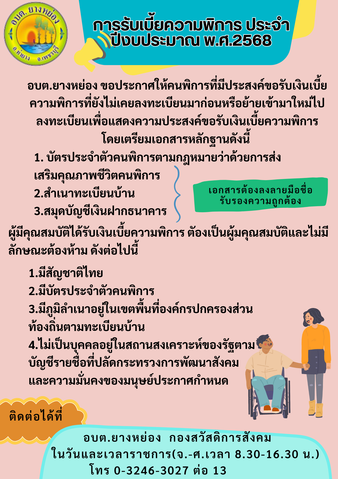 เรื่อง การรับเบี้ยคนพิการขององค์การบริหารส่วนตำบลยางหย่อง ประจำปีงบประมาณ 2568